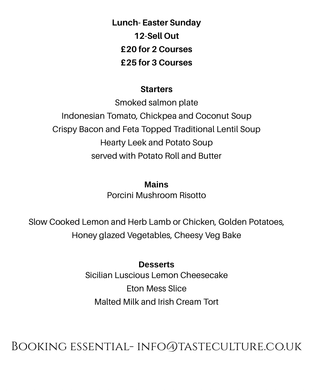 Until the booking system is fully integrated, please book your tables via email. Booking is essential, especially for Saturday & Sunday afternoon!