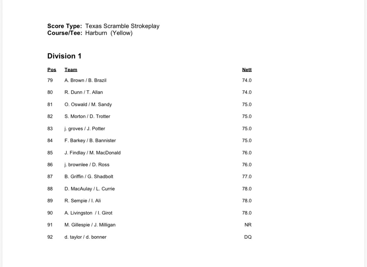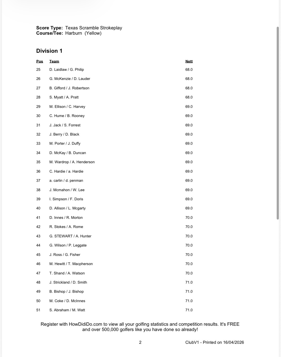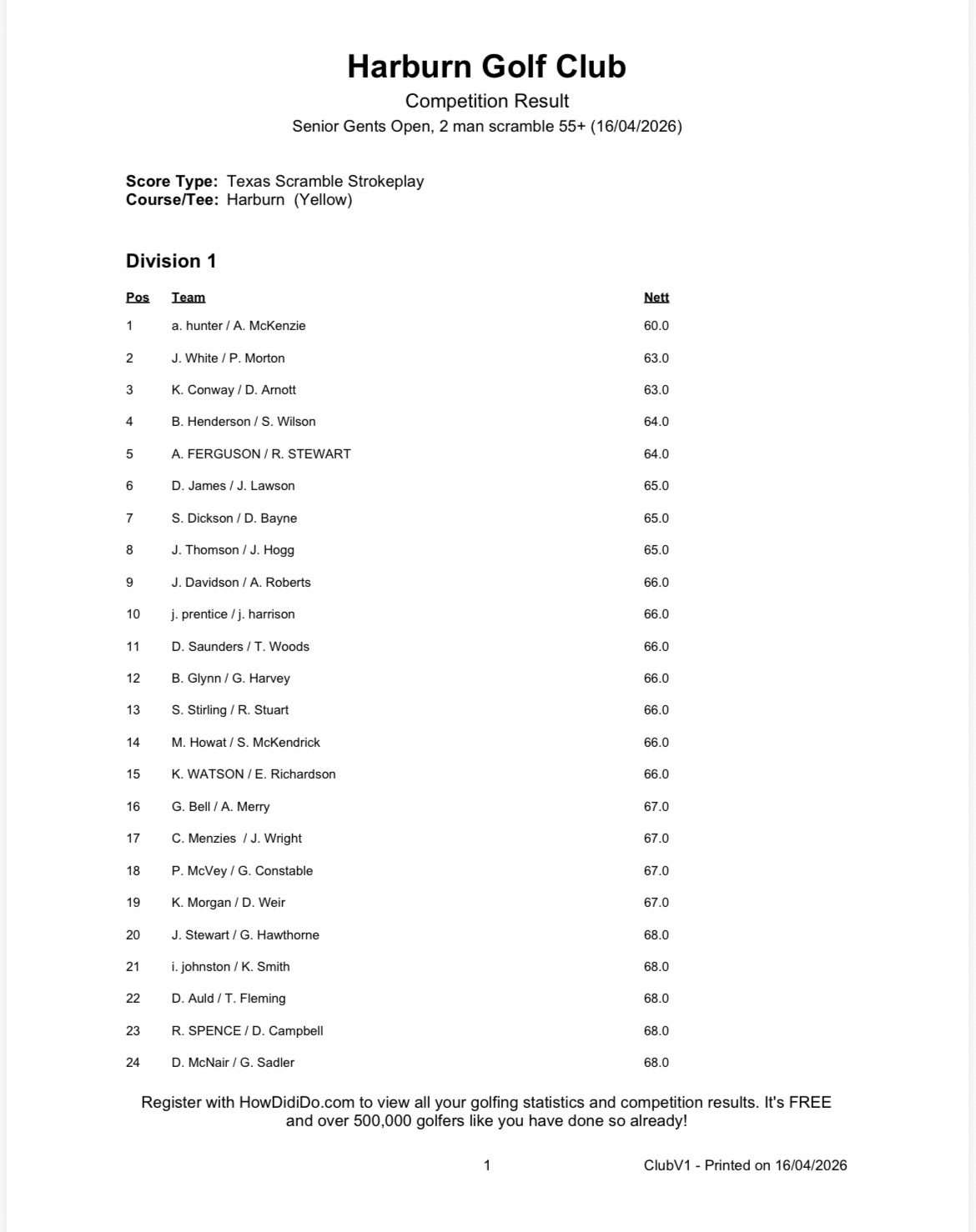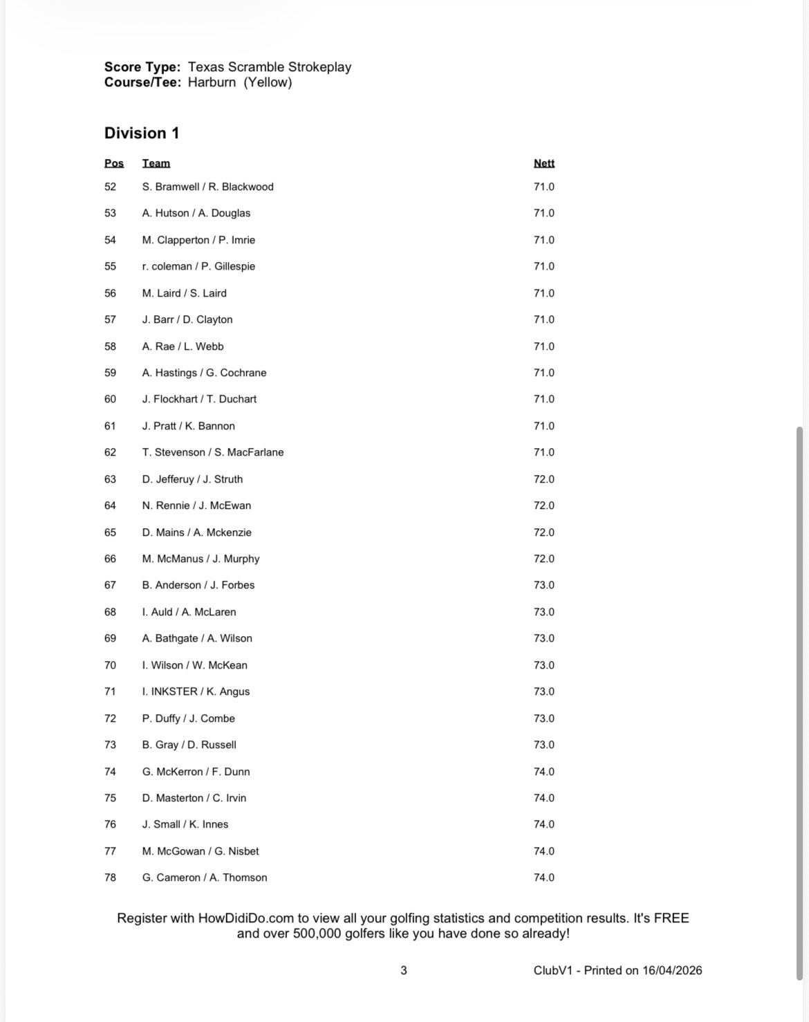 3rd – K Conway (Harburn)/D Arnott (Leven) 63 (bih 31,20) £50 each